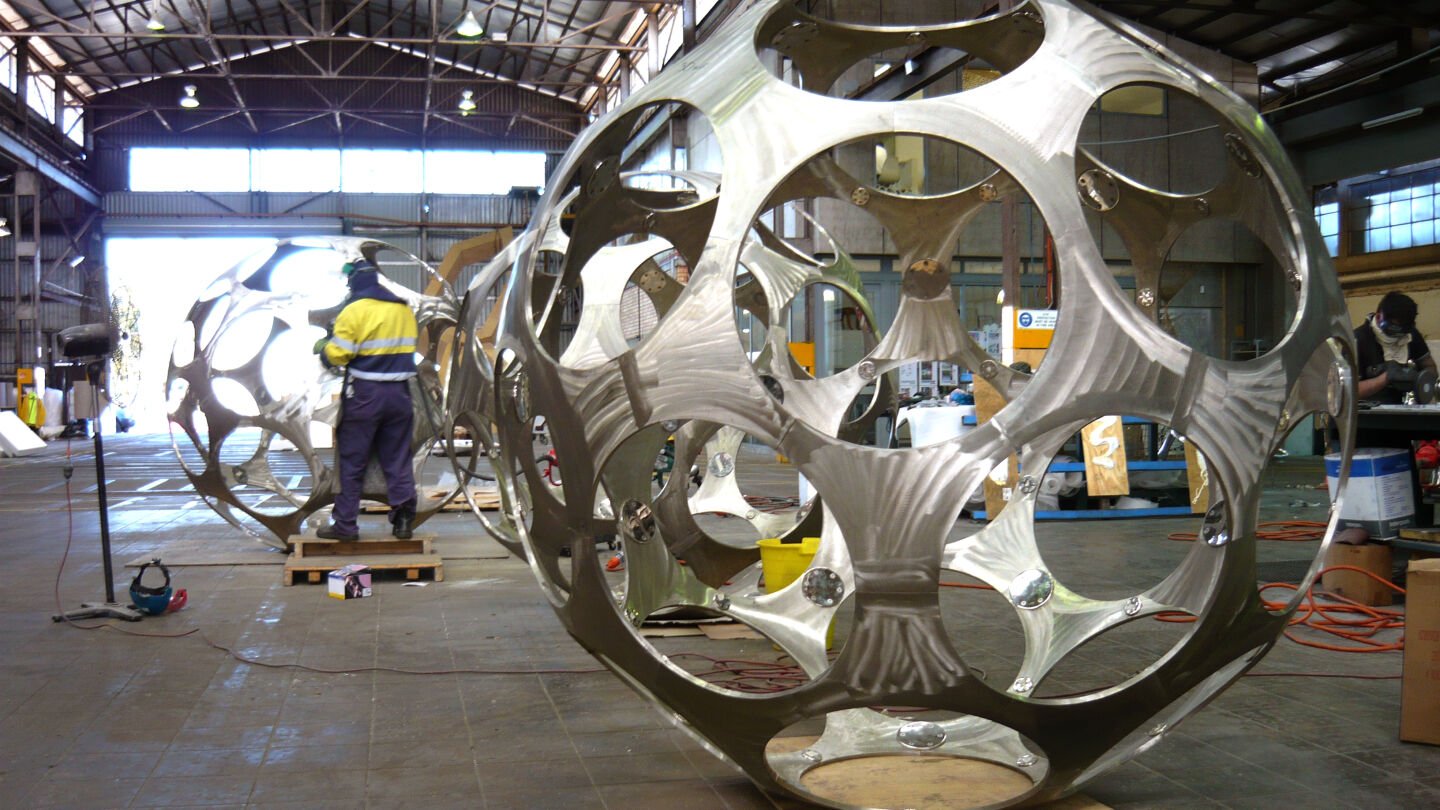 Carsten Höller first presented the Sphere project in Basel’s Museum for Contemporary Art in 1998. He has redeveloped the concept in white brass for the King Abdullah University of Science and Technology (KAUST) International Art Program. Three spheres, each 2.2m in diameter, are positioned at the north entry spine of the university campus. The spheres are based upon a human scale, designed to be entered through the large, round openings.